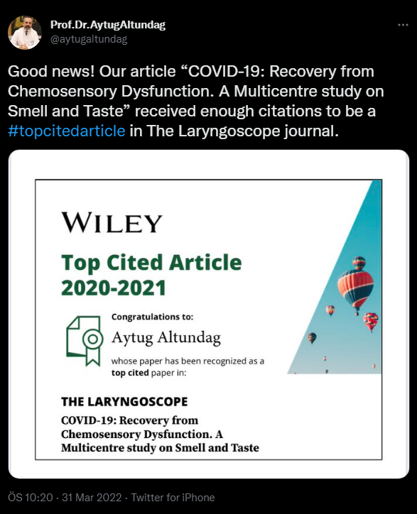 Good news! Our article “COVID-19: Recovery from Chemosensory Dysfunction. A Multicentre study on Smell and Taste” received enough citations to be a #topcitedarticle in The Laryngoscope journal.